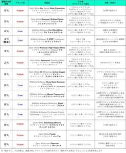 コルゲート オプティックホワイト プロシリーズ ステイン プリベンション、コルゲート オプティックホワイト リニューアル ブリリアントシャインの2種類の歯磨き粉が、過酸化水素濃度が5%で最も高い結果となりました
