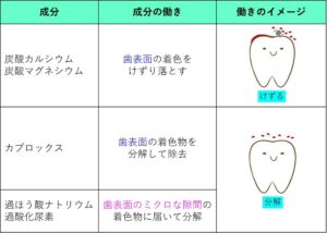 刺激が強い過酸化水素を使わない代わりに、刺激の少ないカプロックス・過ほう酸ナトリウム・過酸化尿素が使われています