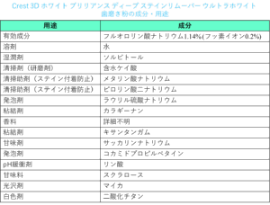 これまでクレストブランドのホワイトニング歯磨き粉を28種類調べてきましたが、フルオロリン酸ナトリウムが配合されているホワイトニング歯磨き粉を見るのは初めてです